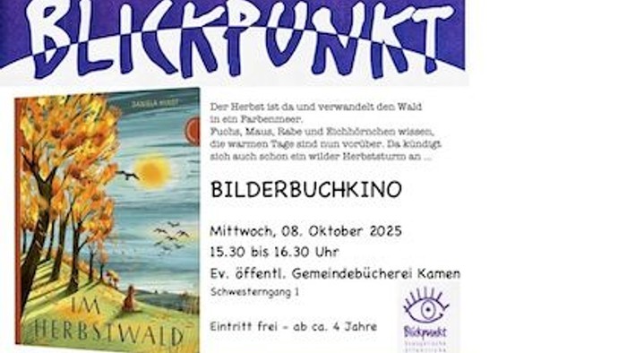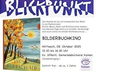 "Im Herbstwald" heißt das neue Bilderbuchkino, das am 8. Oktober um 15.30 Uhr in der Ev. öffentl. Bücherei Kamen für Kinder ab ca. 4 Jahren gezeigt wird. Der Herbst verwandelt den Wald in ein Farbenmeer, die Tiere wissen, dass die warmen Tage vorüber sind. Da kündigt sich ein Herbststurm an ....