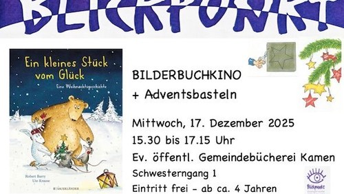 Das Bücherei-Team lädt ein zu einem weihnachtlichen Bilderbuchkino und anschließend zum Adventsbasteln. Geeignet für Kinder ab 4 Jahren. Wegen des begrenzten Platzes beim Basteln ist eine Anmeldung sinnvoll.